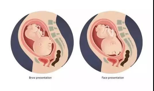②嬰兒的額頭先進入產道,這有時會造成更加困難的分娩,在某些情況下可能需要剖腹產。每750-1700個新生寶寶中會出現一個。
