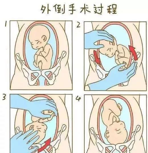 如果通過胸膝臥位操沒能讓寶寶翻身成功,也不要沮喪,enn.....可能是你的功力不夠強。這時候可以考慮由經驗豐富(功力更強)的產科醫生實施 臀外倒轉術((external cephalic version, ECV)。外倒轉(ECV)是指通過向孕婦腹壁施加壓力,向前或向后旋轉胎兒,將近足月臀先露孕婦轉為頭先露的過程。這個聽起來頗有點“神奇”的手法需要的不僅是溫柔的手法,是技術活,也是力氣活,更是一個需要其嚴謹操作的過程,術前有評估、用藥,術后也需密切監測。