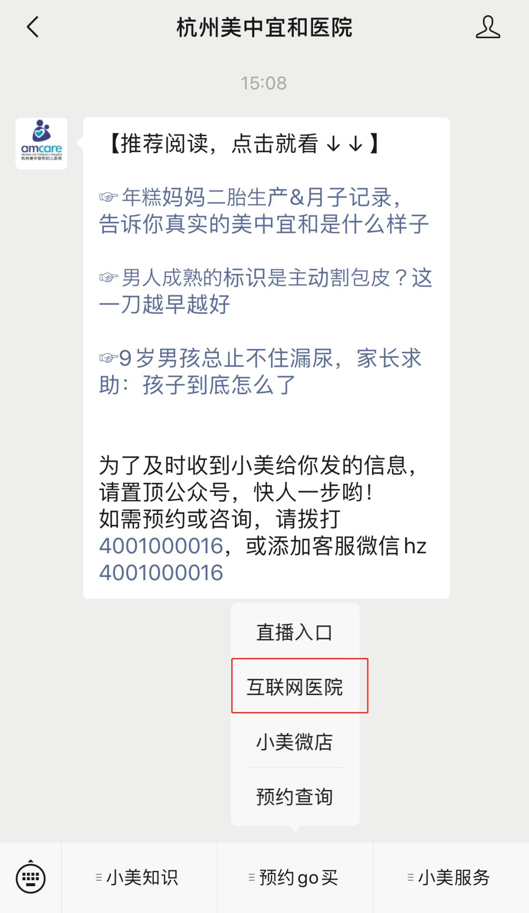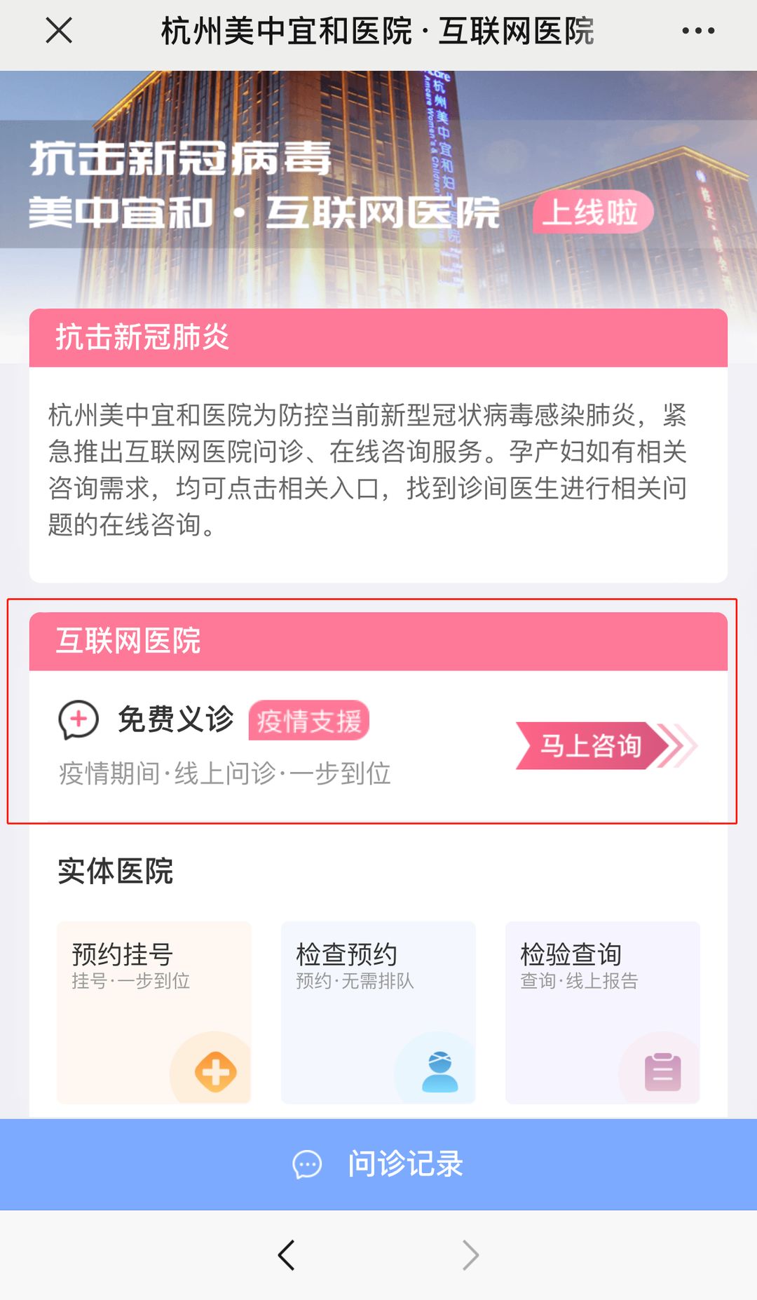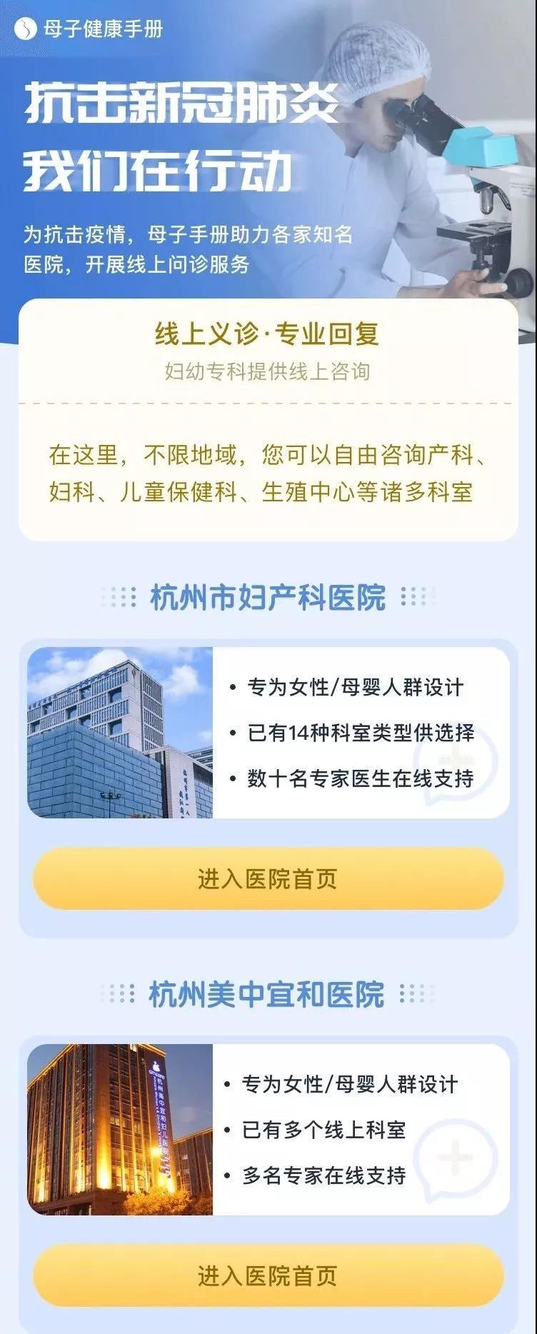 方法一:關注“杭州美中宜和醫院”服務號,從菜單“預約購買”進入“互聯網醫院”,進入“免費義診”專區,選擇“婦產科門診”,進行在線圖文咨詢即可。