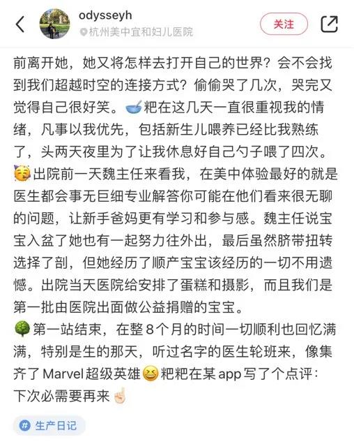近,宜和媽媽劉女士在某書上詳細地記錄了自己的生產日記,從陌生到依賴,再到感動與不舍,即使經歷了順轉剖,她仍然表示這是一趟心滿意足,意義非凡的旅行。