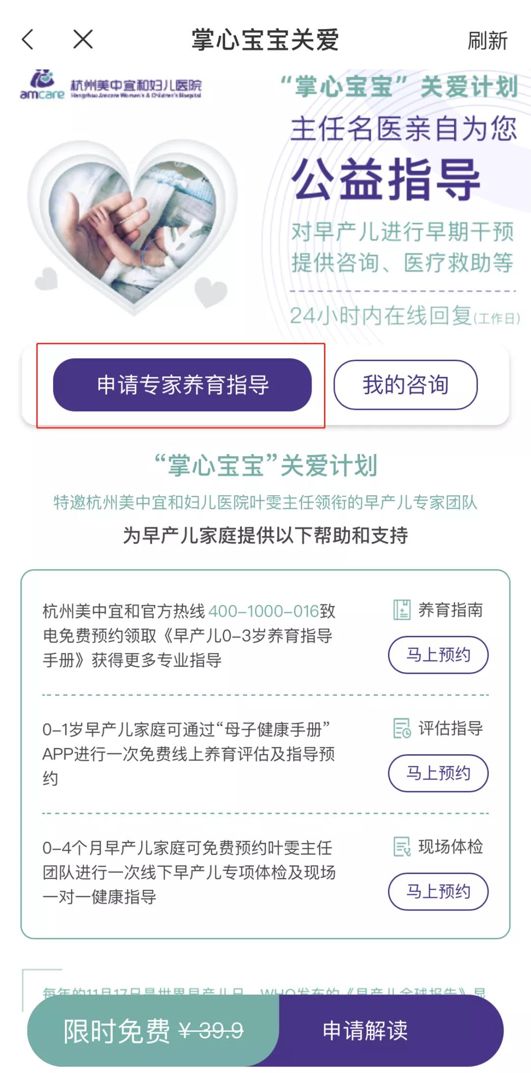 為了更好地幫助更多早產兒寶寶健康成長,杭州美中宜和婦兒醫院與浙江婦女兒童基金會聯合發起掌心寶寶關愛計劃,并邀請葉雯主任帶領的兒科團隊為早產兒家庭提供以下公益醫療支持和幫助: