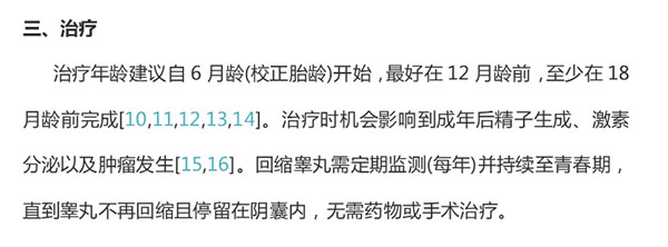 目前國內外指南均建議,隱睪的治療時機應從出生后6個月開始,好12個月前完成,晚不超過18個月。