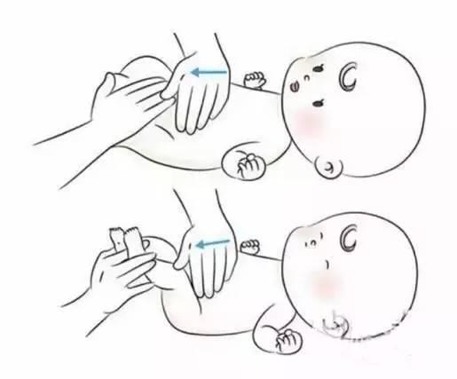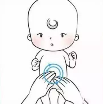 兩只手的拇指放在肚臍兩側,從中心位置向外平行分推開來,力道要慢、緩、柔、圓,以緩解寶寶的脹氣和便秘問題。
