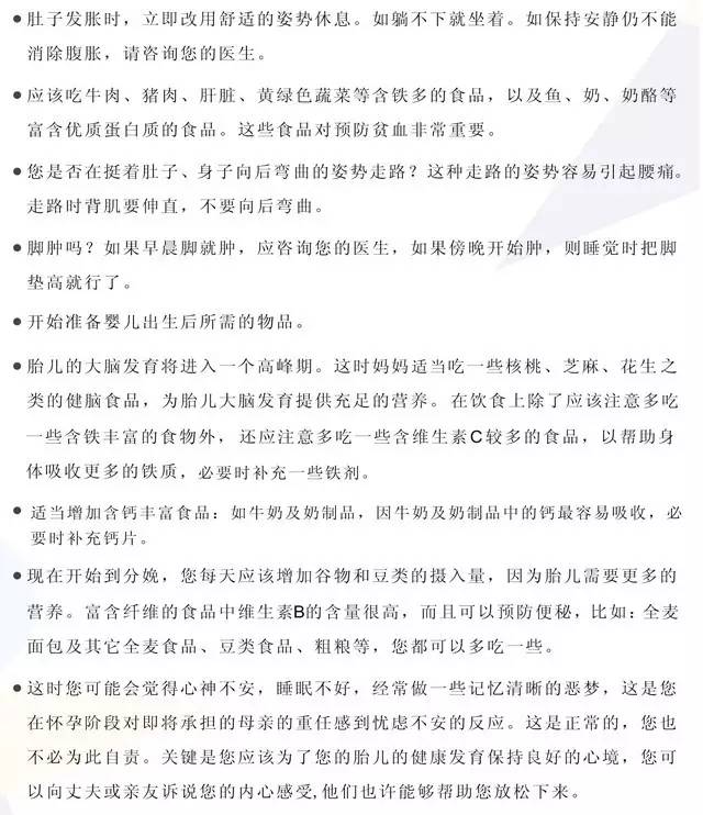 子宮底的高度為21-24厘米,由于受激素的影響,從這一時(shí)期開始,體內(nèi)血容量增加。另一方面,又要為胎兒造血,因此需要大量的鐵。另外隨著腹部的不斷增大,這時(shí)會(huì)發(fā)現(xiàn)肚子上、乳房上會(huì)出現(xiàn)一些暗紅色的妊娠紋,臉上的妊娠斑也明顯起來。有的孕婦還會(huì)覺得眼睛發(fā)干、發(fā)澀、怕光,這些都是正常現(xiàn)象,不必?fù)?dān)心。