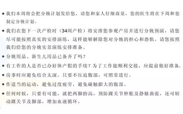 子宮底的高度為28-31厘米,可能會感到骨盆和恥骨聯(lián)合處酸疼不適,不規(guī)則宮縮的次數(shù)增多。有時肚子發(fā)脹,但若安靜一下,癥狀即可消失,無須擔(dān)心。黃褐斑、雀斑開始增多。由于子宮變大,壓迫膀胱,如廁次數(shù)越來越頻繁,今后這一傾向還會更強,甚一大噴嚏或笑一下就會小編失禁,應(yīng)勤上廁所。