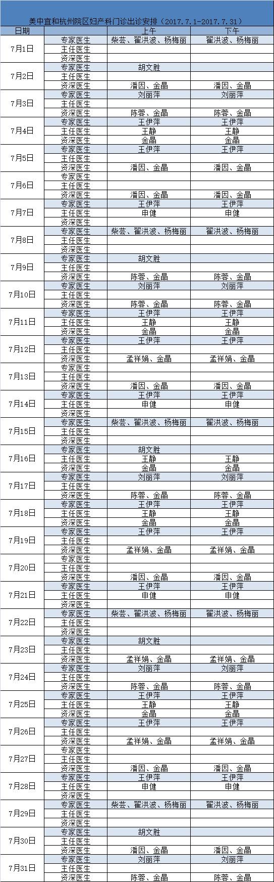 杭州美中宜和婦兒醫院婦產科醫生出診表: