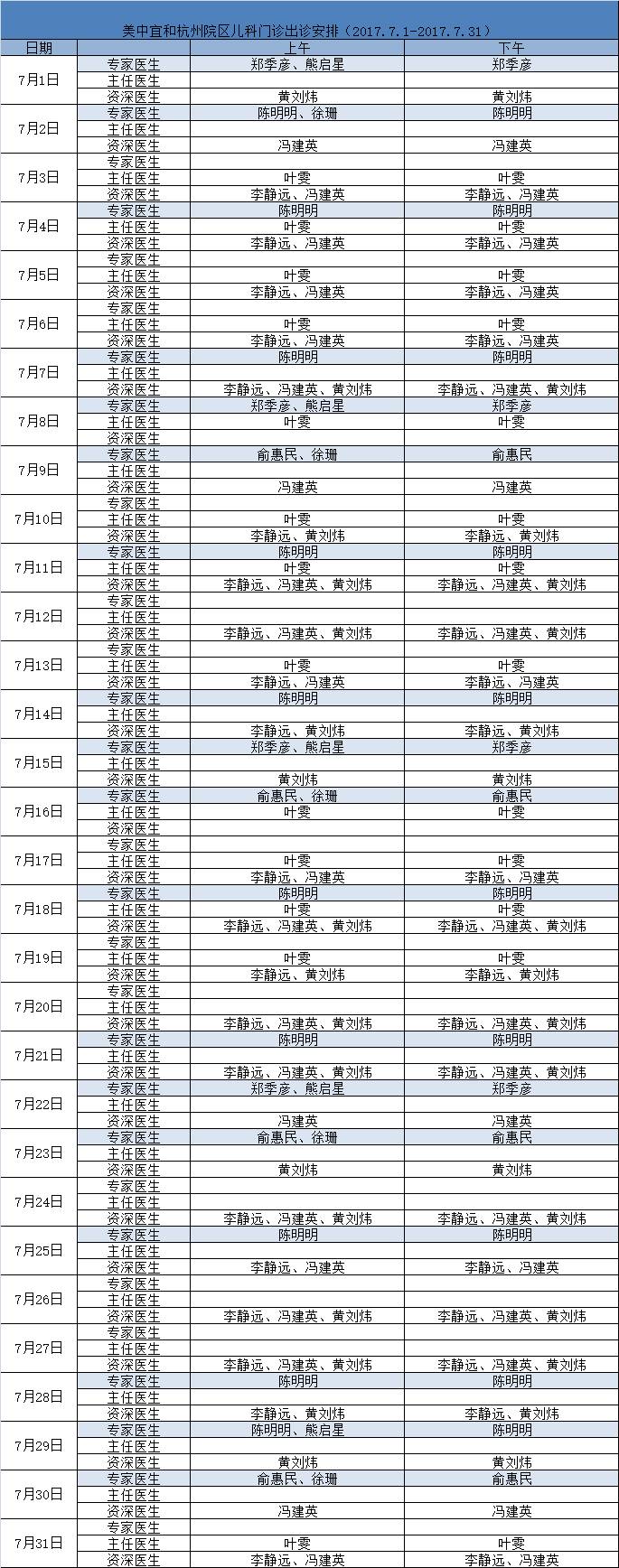 杭州美中宜和婦兒醫院兒科醫生出診表: