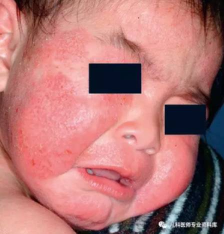 2.皮損好發生在頭皮、面部、耳廓,表現為皮膚皸裂、增厚、滲液和結痂,尿布區一般不受累(因為這個區域摩擦少,濕度大,皮膚水分散失少,因而皮膚屏障功能好)。
