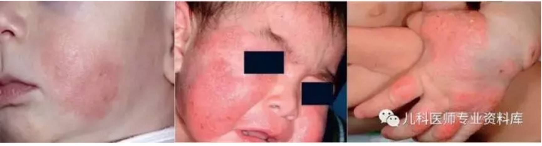 (上圖從左到右分別是輕中重的表現,輕度僅表現皮膚干燥;中度表現為面部有皮膚發紅滲液了;重度表現上,除了面部,孩子的手上都有皮膚增厚了。)