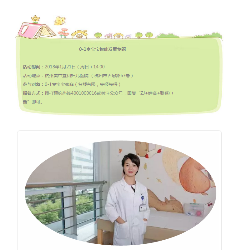 1月21日,杭州美中宜和婦兒醫院兒童保健科馮建英醫生會與大家分享0-1歲寶寶智能發展的那些事兒。讓粑粑麻麻清楚地了解0-1歲寶寶每個階段的生長發育特點,如何在關鍵期對寶寶進行大運動、精細運動、語言認知、適應行為及社交能力的訓練及培養。滿滿的干貨,等你拿走!