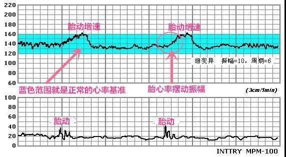 胎心監(jiān)護(hù)圖上主要有兩條線,上面一條是胎心率,正常情況下波動(dòng)在110-160次/分之間,一般基礎(chǔ)心率線(寶寶平靜時(shí))表現(xiàn)為一條波形直線,出現(xiàn)胎動(dòng)時(shí)心率會(huì)上升,出現(xiàn)一個(gè)向上突起的曲線,胎動(dòng)結(jié)束后會(huì)慢慢下降。下面一條表示宮內(nèi)壓力,只要在宮縮時(shí)會(huì)增高,隨后會(huì)保持20mmHg左右。