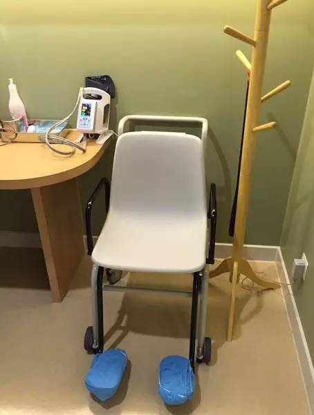 量體重、測血壓、測體溫的地方。測體重的是個椅子,避免孕婦踩不穩造成危險。只要坐在椅子上,體重數就自然讀出了,很省力。測體溫是耳溫槍。